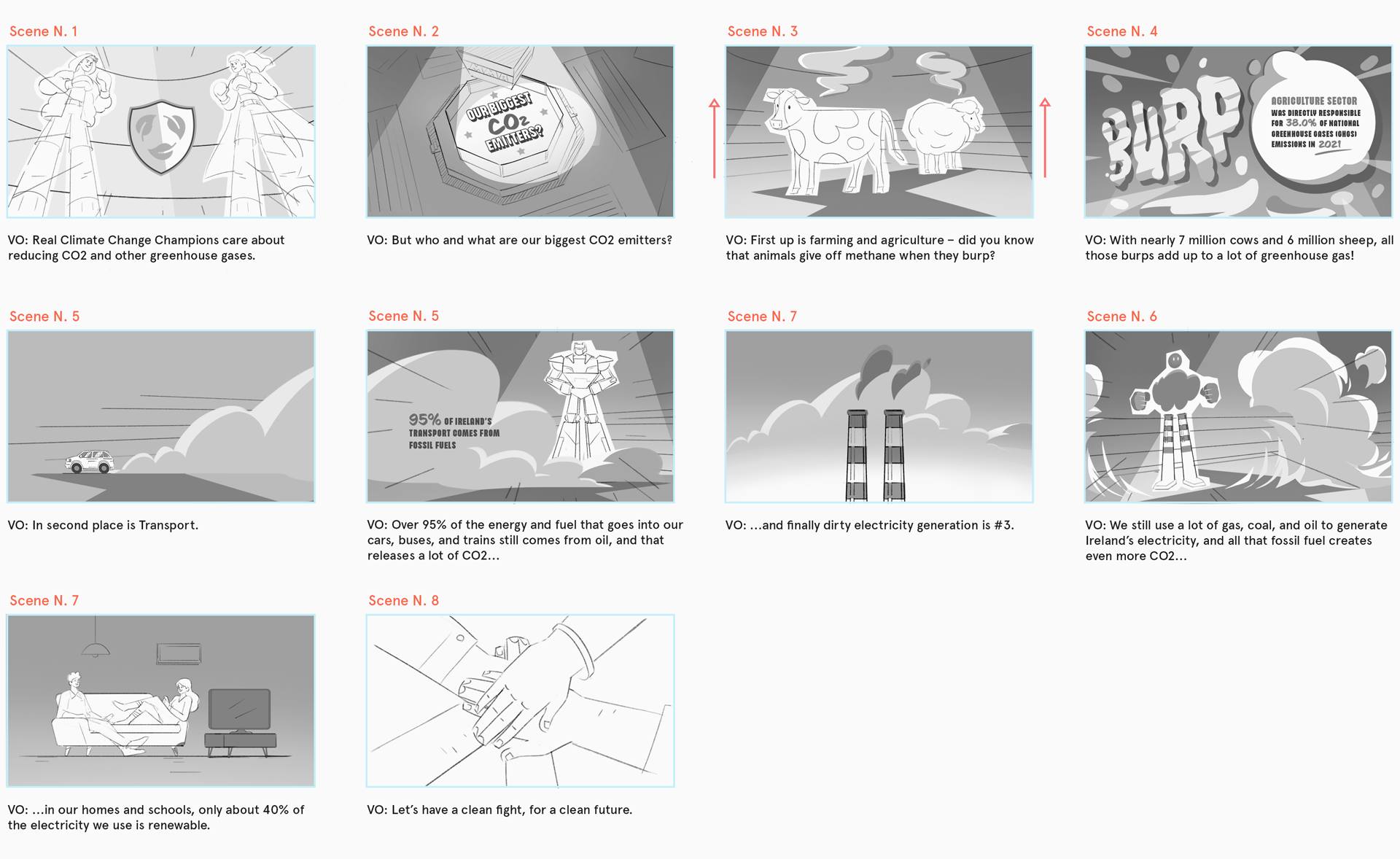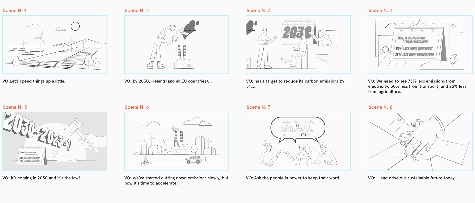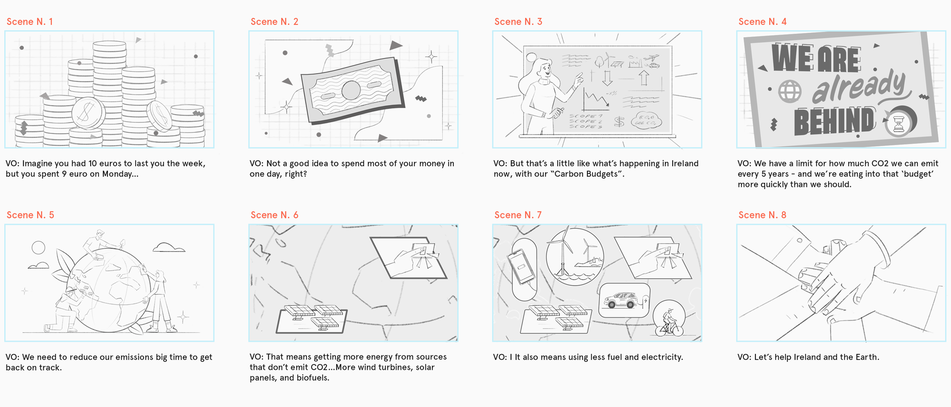 Ilustrações para vídeos animados sobre ações climáticas e uso de energia na Irlanda.